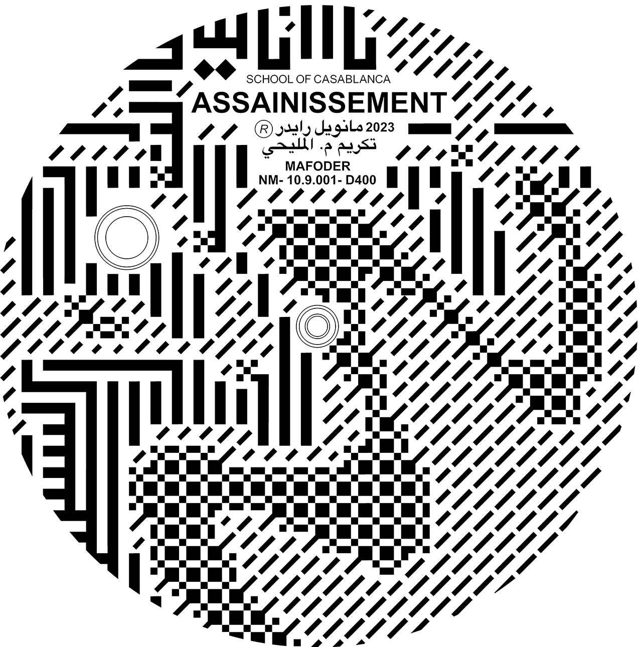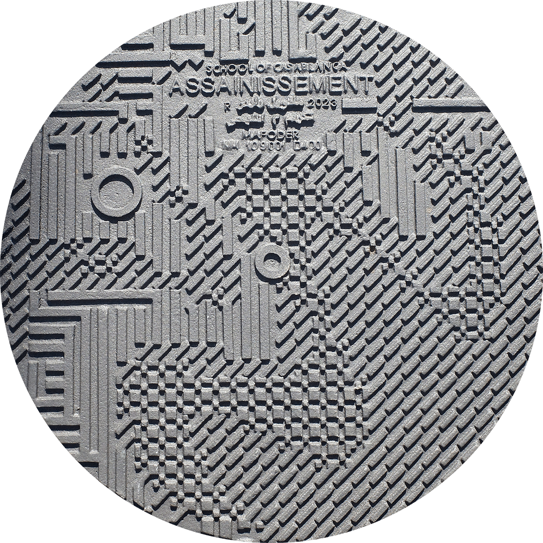Using the wave patterns in the paintings of Mohamed Melehi and Mohammed Chabaâ as reference points, Studio Manuel Raeder transforms carpets, paintings, and patterns into manhole covers. He converts graphic references to the waves into ASCII (American Standard Code for Information Interchange) code, replaces them with the knotted typeface, and creates a pattern, then used for nonslip surfaces on the manhole covers. The symbols used to compose the knotted typeface are the same geometric shapes that appear in the carpets produced in the Atlas Mountains, and they correspond to the knots produced by traditional weaving. Using Mafoder’s existing distribution system, the project is disseminated in the streets and public spaces of Morocco. In this way, it builds on the founding spirit of the Casablanca Art School: taking art outside and making it accessible and available to all.
